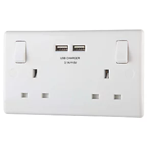 White moulded socket with 2 USB charging ports. Ideal for mobile phones, tablets and other USB devices. Features protective overload function.