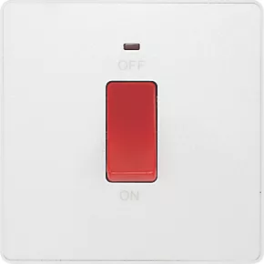 Double pole switch with low power, flush fit LED indicator, for use with cookers and ovens. Features low profile, screwless flat plate that clips on and off, making it ideal for modern interiors.