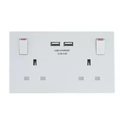 British General 900 Series 13A 2-Gang SP Switched Socket + 3.1A 2-Outlet Type A USB Charger White