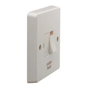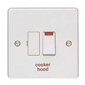 Switched fused connection unit 13A double pole with neon indicator. Marked “Cooker Hood”.