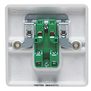 20A double-pole switch. Slim faceplate with curved top and bottom edges. Full-contact cable clamp gives improved cable retention and reduces risk of cable deformation. Inline, upward-facing terminals prevent the need for twisting/turning of plate providing safer and quicker installation. Depth consistent with other products in the Crabtree Instinct range.