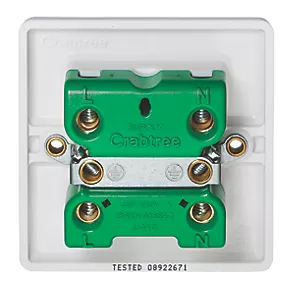 50A double-pole switch. Slim faceplate with curved top and bottom edges. Optimised interiors provide more wiring space reducing risk of cables being crushed. Depth consistent with other products in the Crabtree Instinct range.