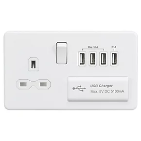 Knightsbridge SFR7USB4MW 13A 1-Gang SP Switched Socket + 5.1A 4-Outlet Type A USB Charger Matt White with White Inserts