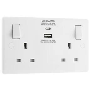 White moulded power socket with A and C USB ports. Up to 30W output with PD and Qualcom 4 charging. Quick and easy to install. Ideal for charging numerous devices, including laptop computers, iPads, iPhones, tablets, mobiles, cameras and MP3s.