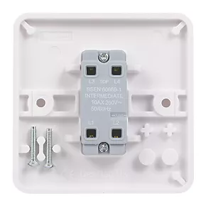 Intermediate switch for fluorescent and inductive loads. Soft-curved moulded profile. Durable anti-microbial urea construction. Ideally suited for new construction and refurbishment projects. Supplied with screw cap covers for a sleek finish.