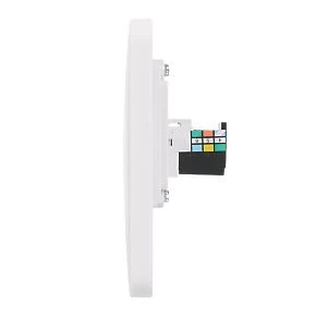 RJ12 telephone and data outlet. Smooth, soft-curved plate profile. Made from durable, high quality urea with antimicrobial properties. Ideally suited for new constructions and refurbishment projects. Supplied with screw cap covers for a sleek finish.