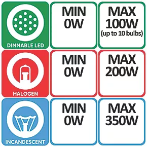 | Advisory Notice | Not suitable for non-dimmable fluorescent bulbs or tubes, wirewound or torodial transformers, fans or motors. |
